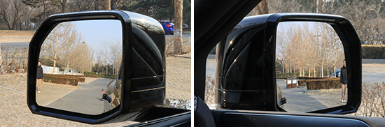 评测车两侧外后视镜均未采用双曲率镜片,好在镜片面积较大。经实测,左外后视镜视野范围为24.1°,处于同级别中游水平;右外后视镜视野范围为21.2°,处于同级别上游水平。