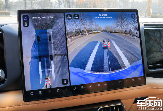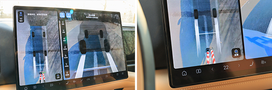 评测车配备360度全景影像,画面清晰度和畸变控制都很不错。控制按键位于屏幕中部,支持多种角度调节,操作简单方便。值得一提的是,位于屏幕左侧的俯视图内还会显示车辆与障碍物之间的距离,与实测数据较为接近,搭配可随动转向的倒车辅助线,实用性表现令人满意。