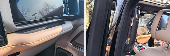 评测车在前排中控台两端、副驾驶前方以及B柱位置均配有扶手,搭配电动脚踏板,乘员上下车时并不会显得过于“狼狈”。此外,如果遇到颠簸路段或是进行越野时,车内扶手也有助于乘员更好的固定住身体。