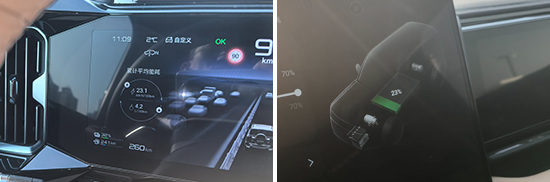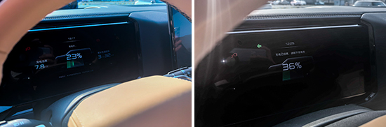 此外,对于充电效率我们也进行了测试。实测人员使用快充桩充电10分钟后(波峰用电),电量从23%充至36%,与车辆电脑预计的用时基本吻合。