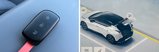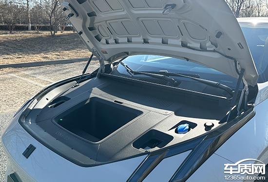 机舱盖的开启开关位置位于驾驶位前部左下方,开启时需要拉动车内开关两下,然后顺势抬起机舱盖即可。评测车的机舱盖采用双液压杆支撑,稳定性不错,开启和关闭过程均较为轻松。