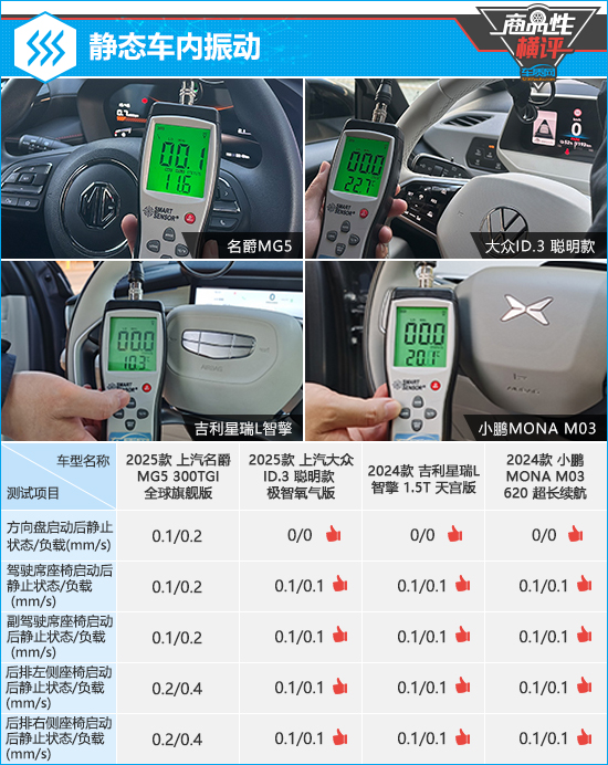 在静态车内振动测试中,大众ID.3聪明款、吉利星瑞L智擎和小鹏MONA M03的整体表现相同,不仅方向盘在启动后静止/负载状态下的数值均为0,其他部位的振动数值也均未超过0.1mm/s,对于车内乘员的舒适度影响甚微。相比之下,名爵MG5的振动数值就明显要偏高一些,实际体感较为明显,对测试成绩造成了一定影响。