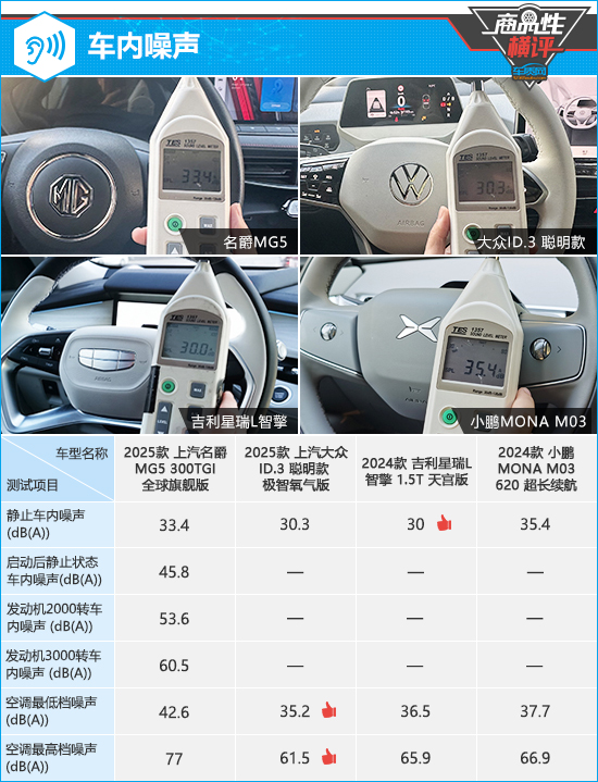 经实测,在静止状态下,吉利星瑞L智擎对于车外噪声隔绝相对出色,实测噪声值仅为30dB。由于大众ID.3聪明款和小鹏MONA M03均采用电动机驱动、吉利星瑞L智擎怠速状态下发动机默认不工作,因此车辆启动后不会出现明显的噪声。名爵MG5的发动机在怠速、2000转以及3000转时的噪音表现可圈可点,整体属于同级别车型平均水平。