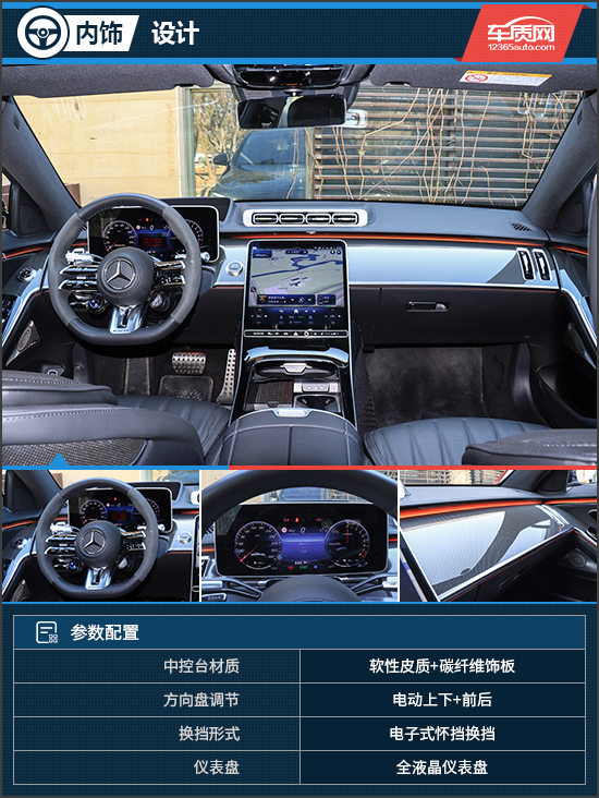 内饰方面,AMG S 63将奔驰S级的豪华感和AMG专属的运动设计拿捏得恰到好处。整个中控台铺满了碳纤维材质的装饰板,结合随处可见的高档皮质包裹,彰显出不俗的身份。评测车使用的是AMG高性能方向盘,两侧带有翻毛皮材质,下方集成了AMG操控单元,方便驾驶员调节驾驶功能和模式等。