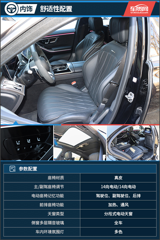 作为奔驰的顶级旗舰轿车,舒适性方面无需任何担心。像前/后排座椅的加热、通风功能,以及真皮材质座椅、分段式电动天窗、后排座椅太空头枕均有所提供。另外,右后老板座还提供了电动调节的腿托,加上半躺的坐姿,别提有多惬意了。