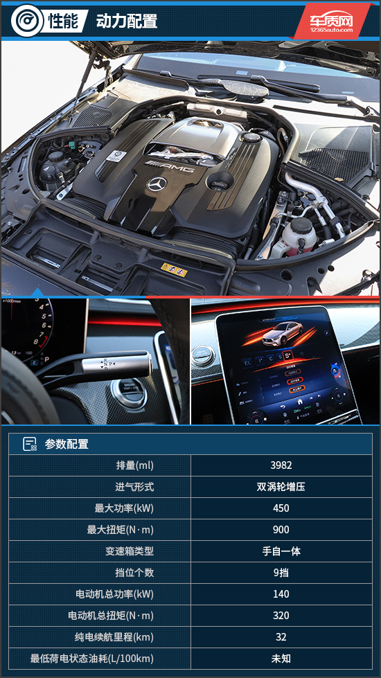 动力方面无疑是这台车最大的亮点,搭载了源自F1赛车的E Performance高性能混合动力系统,前轴配备了“一人一机”的AMG 4.0升V8双涡轮增压发动机,最大功率450kW,配合位于后轴的电机,综合输出功率达590kW,百公里加速仅需3.3s。