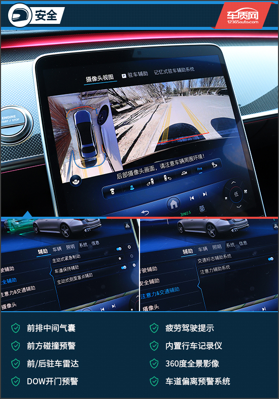 安全配置方面,评测车拥有非常丰富的主/被动安全配置,包括前排中间气囊、疲劳驾驶提示、前方碰撞预警、前/后驻车雷达、360度全景影像以及车道偏离预警系统等。其中,360度全景影像画质清晰,并配有可随动转向的驻车辅助线,帮助驾驶者更轻松地完成倒车入库等操作。