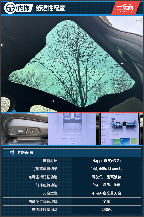 舒适性配置方面,评测车配备不可开启全景天窗,面积宽大,并且采用第三代柔性电致变色技术,行业首次采用黑灰中性色,总能量通过率最低12%,能够智能感应环境光线,主动适应性调节透光度,时刻保持最舒适的状态。座椅选装了Nappa真皮,支持多向电动调节且填充物较为柔软,再加上前排座椅加热、通风以及按摩功能,乘坐舒适性表现值得肯定。此外,评测车还配备了全车侧窗多层隔音玻璃,保障了行驶时的静谧性。