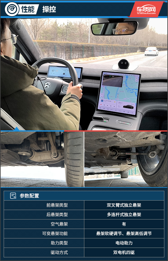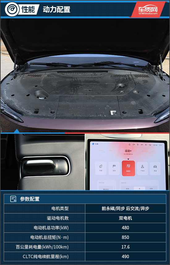 评测车搭载由前后双电机组成的动力系统,电动机总功率480kW,总扭矩达到850N·m。匹配的电池容量为75kWh,CLTC纯电续航里程为490km。