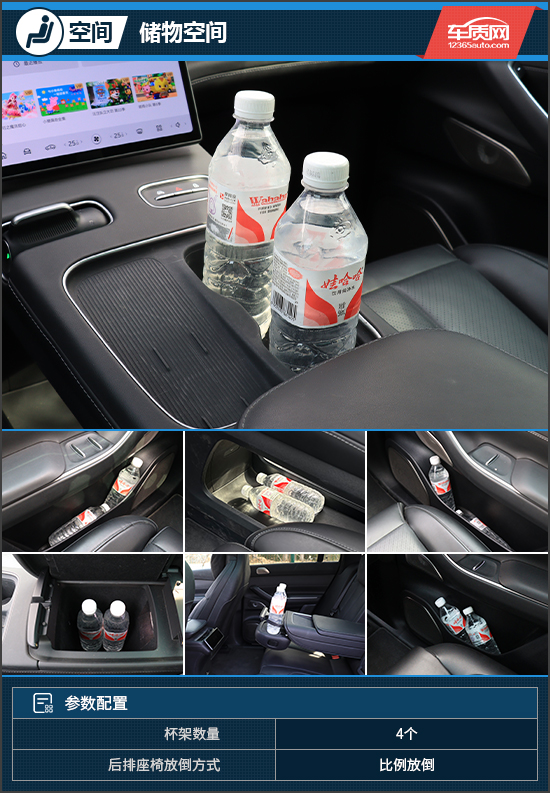 中控台上方设置了一个手机槽,拿放手机十分顺手,且具备40W无线充电功能。评测车还配备了23个喇叭,功率达到1000W,并引入了杜比全景声技术,拥有出色的音质表现。