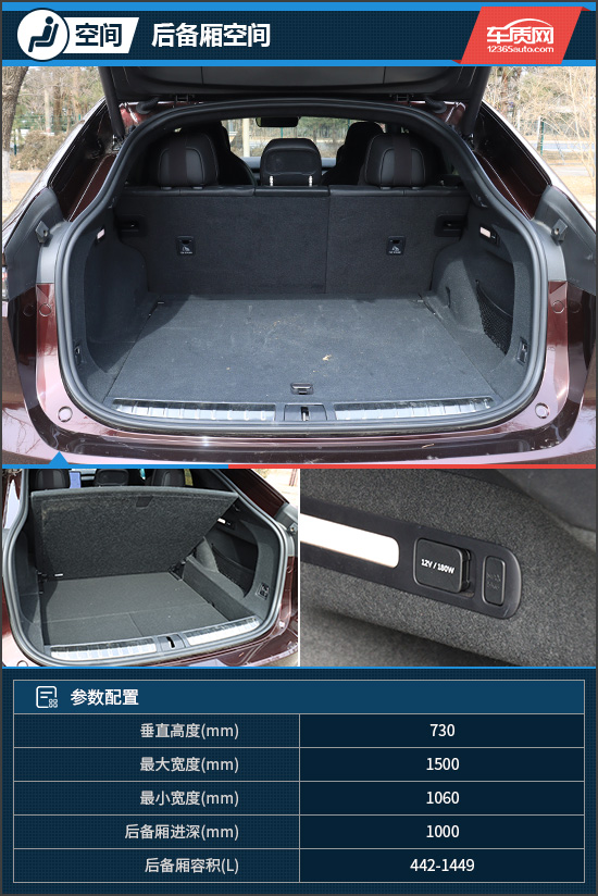 评测车的后备厢内部十分规整,容积也可圈可点,在常规状态下容积为442L,放倒后排座椅后,容积达到1449L。并且后备厢下方还配有一个较大的储物空间,可以放置不少物品,实用性表现出色。