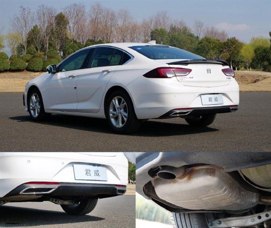 值得一提的是,别克君威的车尾虽然采用了双边共两出的排气管造型设计,但真正的排气管是隐藏在车尾底部的左侧位置,属于单出排气布局。