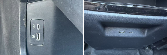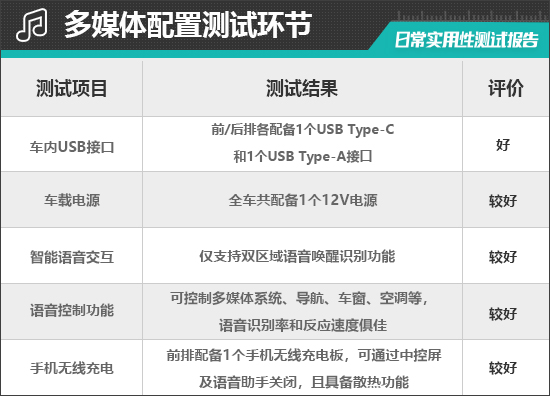 评测车的前/后排各配备1个USB Type-C接口和1个USB Type-A接口,前者位于中控台下方,后者位于后排空调出风口下方,布局合理且兼容性不错。此外,中控台下方还提供1个12V电源接口,能够满足车内乘客多种电子设备的用电需求。