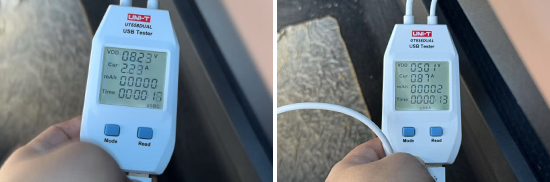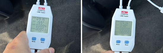 同时,我们对各个USB接口的电压与电流进行了测试,前排USB Type-C接口的最高电压和最高电流为8.23V和2.23A左右;USB Type-A接口的最高电压和最高电流为5.01V和0.87A左右。后排USB Type-C接口的最高电压和最高电流为9.16V和1.55A左右;USB Type-A接口的最高电压和最高电流为5.16V和0.1A左右,整体表现可圈可点。