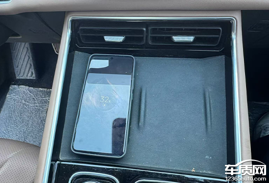 评测车在前排配备了1个50W手机无线充电板,位于仪表台下方,拿放手机十分便捷。并且充电功能可通过中控屏手动关闭,且具备散热功能,非常实用。