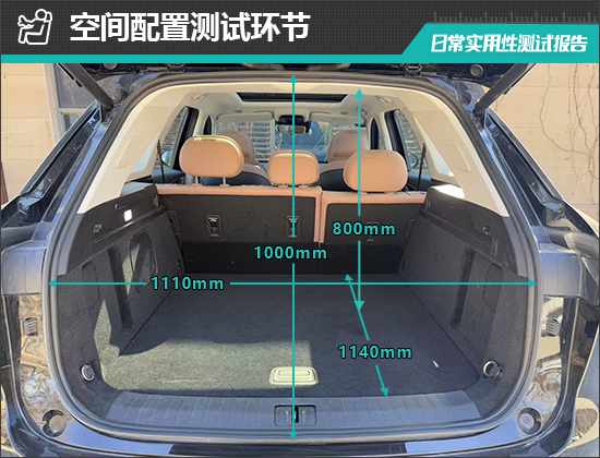 对于后备厢的基础数值,我们也进行了实测,开口长度为1000mm;开口宽度为1110mm;后备厢进深为1140mm;后备厢地台与顶部的垂直高度为800mm。