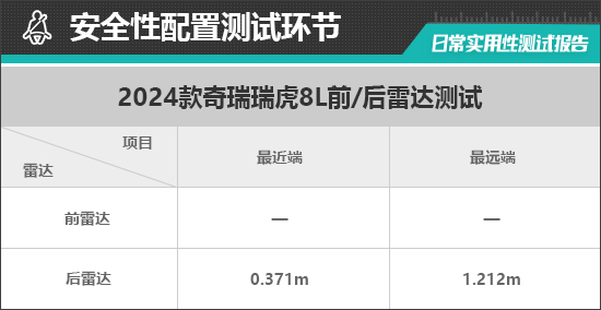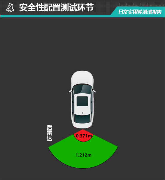 在测试过程中,因评测车未配备前雷达,因此无法测得有效数据。倒车雷达在1.212m处可感应到后方物体,雷达功率较低,从实测数据来看,评测车的倒车雷达持续蜂鸣提示距离为0.371m,未达到同级别平均水平。