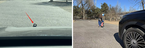 在测试前方视野环节,我们采用高70cm的桩桶作为参照物,随后调整车距,直至在主驾驶位可以看到桩桶上沿。经过测试,桩桶与车头最终测得的数据为2.981m,在测试过的同级别车型中处于中下游水平。