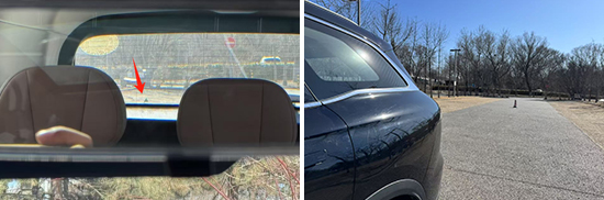 后方视野测试中,依旧将桩桶固定摆放,随后移动车辆直至可以观察到桩桶上沿为止。经实测,后方视野所测得的距离为17.311m,同样在测试过的同级别车型中处于下游水平。