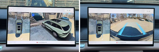 评测车配备了360度全景影像,实测整体画质清晰度不错且没有畸变。同时,画面支持多个角度查看,并配有可随动转向的倒车辅助线,帮助驾驶者更轻松地完成倒车入库等动作,实用性表现符合预期。