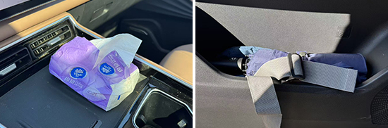 经过实测,评测车全车共计12个储物空间(不含杯架),上述固定物品除墨镜外,均具有合适的储物空间进行摆放,并且位置设计合理,拿取物品十分方便。