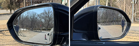评测车的左/右外后视镜均采用了普通镜片,实测左外后视镜视野范围为22.8°,处于同级别下游水平;右外后视镜视野范围为22°,处于同级别上游水平。