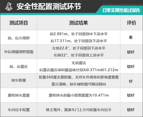 在车辆前、后方视野测试中,车内所有座椅均已调整至最低状态,所测出的数据与驾驶者正常使用时均有一些偏差,仅供参考。