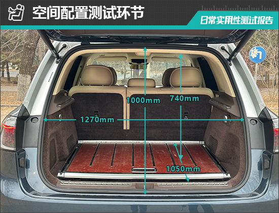 对于后备厢的基础数值,我们也进行了实测,开口长度为1000mm;开口宽度为1270mm;后备厢进深为1050mm;后备厢地台与顶部的垂直高度为740mm。