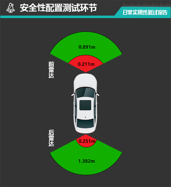 前驻车雷达最远可在0.891m处感应到前方物体,雷达功率表现可圈可点,持续蜂鸣提示距离为0.211m,表现未达到同级别测试车型的平均水平。