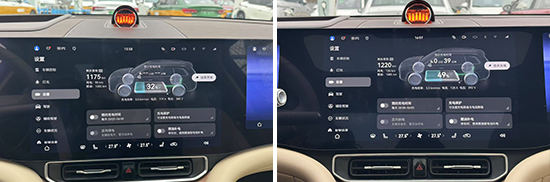 此外,对于充电效率我们也进行了测试。实测人员使用快充桩充电10分钟后(波峰用电),电量从32%充至49%,续航里程增加45km,与车辆电脑预计的用时基本吻合。