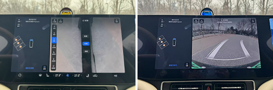 评测车配备了360度全景影像,实测整体画质清晰度不错且没有畸变。同时,画面支持多个角度查看,并配有可随动转向的倒车辅助线,帮助驾驶者更轻松地完成倒车入库等动作,实用性表现符合预期。