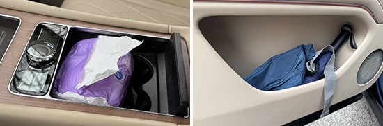对于车内使用空间的测试,只针对前排触手可及的空间,不包括手套箱、中央扶手箱等需开启的空间。测试方法是将以下固定物品全部放置在前排的各个储物空间内,通过固定物品的放置情况来判断车辆储物空间的表现。测试选定的固定物品为:2瓶常规大小的矿泉水、1部大屏手机、1支口红、1个挎包、1副墨镜、1把折叠雨伞以及1包常规尺寸的抽纸。