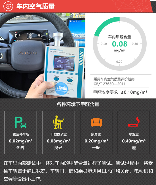 在车内空气质量测试环节,将车辆放置在车辆较少的内部地面停车场中,实测2025款AION RT的车内甲醛含量为0.08mg/m3,符合2012年3月1日起实施的,由原环保部和国家质量监督检验检疫总局联合发布的《乘用车内空气质量评价指南》(中华人民共和国国家标准GB/T 27630-2011)中的相关标准。