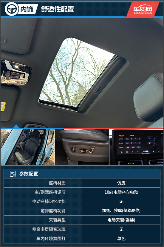 舒适性配置方面,评测车选装了电动天窗,具有一定的透光性。座椅为仿皮材质,支持电动调节且填充物较为柔软,再加上前排座椅加热以及驾驶位按摩功能,乘坐舒适性表现值得肯定。