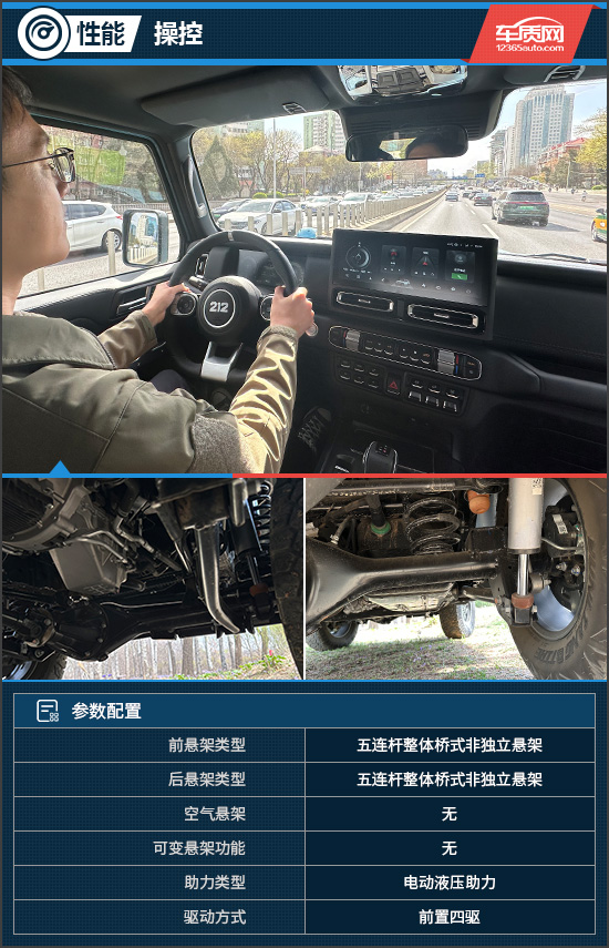 评测车为非承载式车身结构,拥有出色的刚性,并且还采用了前后五连杆整体桥式非独立悬架,是一台标标准准的硬派越野车。但在日常驾驶中,由于悬架和车身重心偏高,在面对减速带以及弯道的时候,会有明显的弹跳和侧倾。