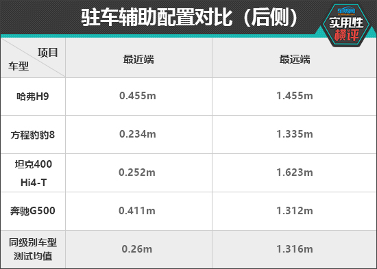 在后驻车雷达测试中,除了奔驰G500外,其他三款车型的最远探测距离均超过了同级别车型测试均值,雷达功率表现相对较好。最近提示距离方面,坦克400 Hi4-T与同级别车型测试均值最为接近。