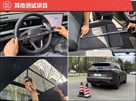 此外,我们还针对驻车雷达、灯光/视野、操控系统、轮胎、天窗、座椅、后备厢进行了测试。经过测试,2025款上汽大众途昂Pro的方向盘和驾驶席座椅调节范围较大,第二排座椅支持前后调节和靠背调节,第三排座椅还提供了电动放倒功能。评测车配备固特异鹰驰 F1 ASYMMETRIC 3系列轮胎,采用不对称花纹设计,具有出色的抓地力,保证高速驾驶时的稳定性,并且可以缩短干湿地制动距离,轮胎规格为265/45 R21。相对而言,第二排座椅座垫长度偏短,存在优化空间。
