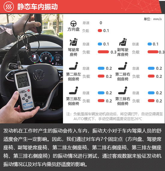 在静态车内振动测试环节,怠速状态下,2025款上汽大众途昂Pro方向盘位置的振动数值为0,第二排和第三排座椅的振动数值略高于前排座椅。负载状态下,方向盘和前排座椅的振动数值略有增加,而第二排和第三排座椅的振动数值保持不变。