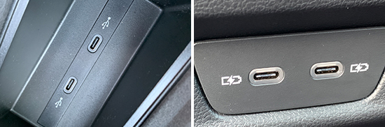 评测车共配备4个USB Type-C接口,其中,前排2个接口位于前排杯架前方,后排2个接口位于后排空调出风口下方,布局合理但兼容性不佳;同时,车内还提供1个12V电源接口,能够满足车内乘客多种电子设备的用电需求。