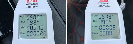 此外,我们对USB接口的电压与电流进行了测试。其中,前排USB Type-C接口的电压和电流分别为5.06V和1.92A;后排USB Type-C接口的电压和电流分别为5.13V和1.92A。