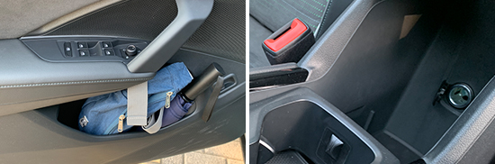 对于车内使用空间的测试,只针对前排触手可及的空间,不包括手套箱、中央扶手箱等需开启的空间。测试方法是将以下固定物品全部放置在前排的各个储物空间内,通过固定物品的放置情况来判断车辆储物空间的表现。测试选定的固定物品为:2瓶常规大小的矿泉水、1部大屏手机、1支口红、1个挎包、1副墨镜、1把折叠雨伞以及1包常规尺寸的抽纸。