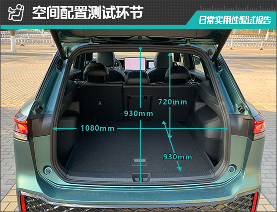 后备厢内部空间十分规整,空间利用率相当高。同时,后排座椅支持4/6比例放倒,扩展能力出色。对于评测车后备厢的基础数值,我们也进行了实测,开口长度为930mm;开口宽度为1080mm;后备厢进深为930mm;后备厢地台与顶部的垂直高度为720mm。