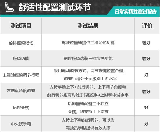座椅方面,评测车主驾驶座椅电动调节按键位于座椅侧面,调节按键位置合理。此外,评测车驾驶位座椅支持三组记忆功能,前排座椅选装三档加热功能,舒适性配置较好。