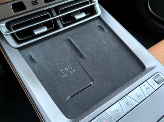 两台车的中央通道都是使用了双层式布局,并且在上层位置配备了一个手机50W无线快充,实用性确实很高。而在充电面板的后方则是车内为数不多的实体按键,这里可以对车辆的驾驶模式、空调、音量等进行快捷操作,中间的位置则是车辆的启动按钮,第一次开的话还是要稍微熟悉一下。