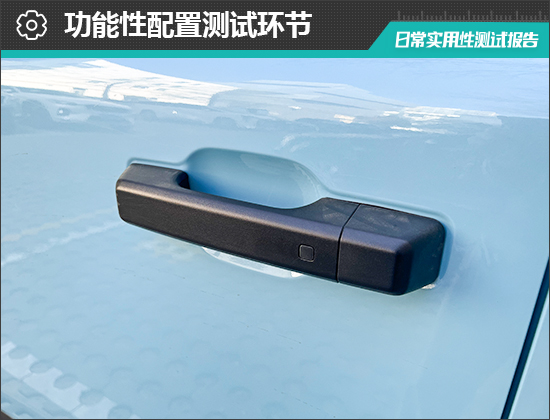 评测车配备主驾驶无钥匙进入功能。驾驶者需要携带智能钥匙靠近车辆,并按下门把手末端解锁/上锁按键即可,实测解锁和上锁过程均十分顺畅,整体表现令人满意。