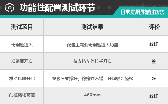 对于消费者来说,门槛离地高度一定程度上决定了上下车便利性。评测车采用1.5英寸升高的氮气减振器,但提供了固定的脚踏板,门槛离地高度为460mm,达到同级别车型平均水平,驾乘人员日常上下车较为便捷。