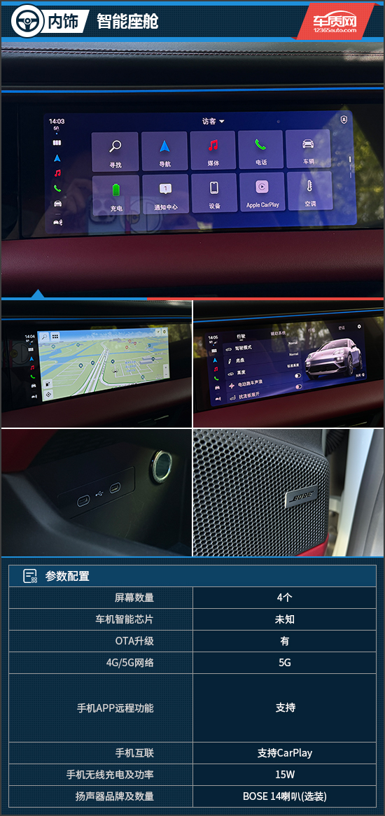 多媒体系统没有真正意义上的主页,UI设计以各项功能界面和主菜单相结合,左侧还配有导航栏。实际体验发现,很多与驾驶相关的功能隐藏在二级甚至三级菜单中,设置时比较繁琐。此外,评测车选装了14扬声器的BOSE音响系统,支持音效调节,低音渲染较重,很适合听流行乐。
