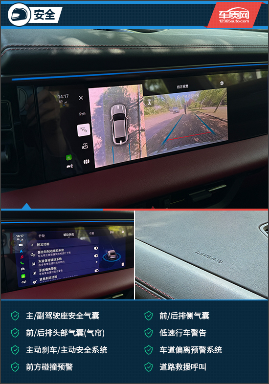 安全配置方面,评测车的功能齐备,并且绝大多数均为全系标配,值得肯定。此外,评测车的全景影像系统不仅画质清晰,辅助线可随动,而且还支持摄像头清洗,很人性化。