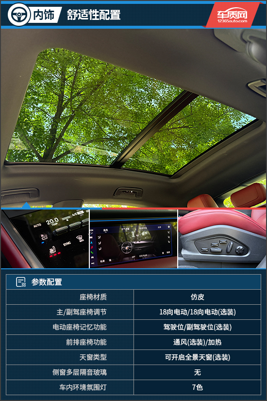 舒适性配置方面,前排座椅选装了18向调节、记忆和通风功能,大幅提升了前排乘客的乘坐舒适性。此外,可开启全景天窗也同样为选装配置,价格不菲,达到了1.53万元。如果想进一步提升车内静谧性,还可以选装全车侧窗多层隔音玻璃,当然价格同样不便宜,为9400元。