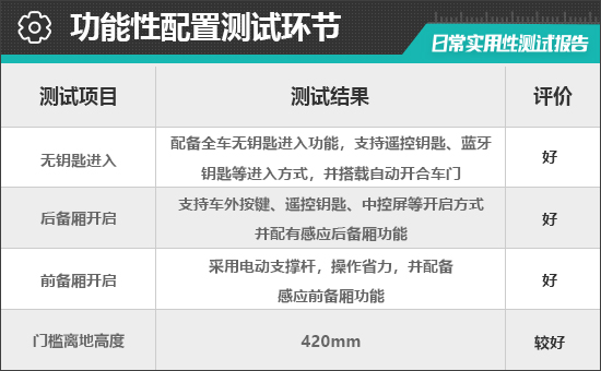 对于消费者来说,门槛离地高度一定程度上决定了上下车便利性。根据实测结果来看,评测车门槛离地高度为420mm,驾乘人员日常上下车比较方便。